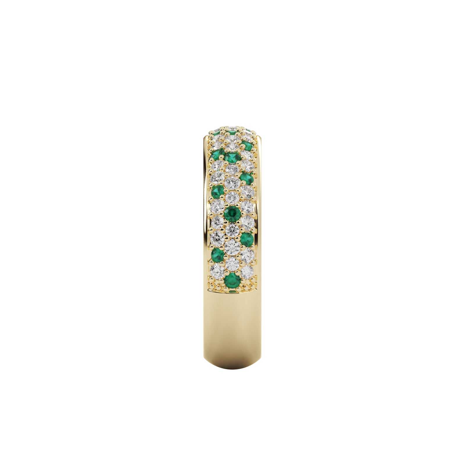 Elevate your elegance with the emerald glow band ring, a harmonious blend of vibrant emerald gemstones and brilliant lab grown diamonds set in a sleek band design.